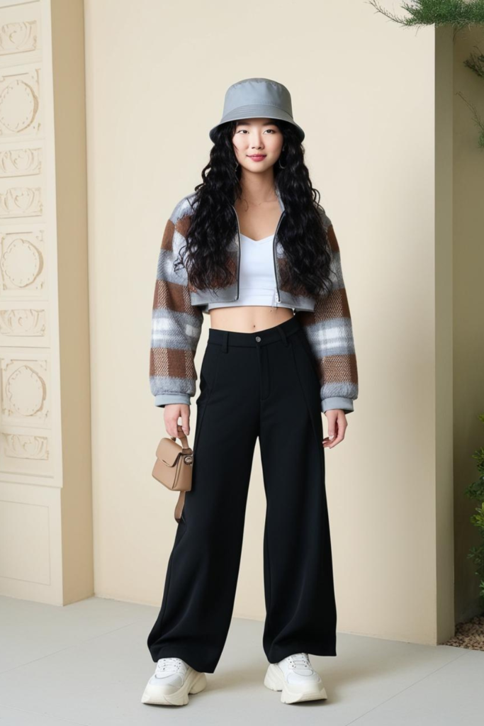 Begin your outfit with a fitted turtle neck top which forms the essential piece of any K-drama lead’s wardrobe. The “I own 51% of this restaurant” look emerges when you place the shirt into high-waisted black trousers or a pencil skirt.